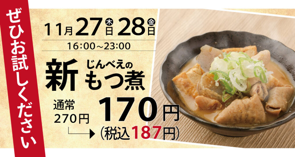 Blog店舗情報 【じんべえ太郎】11月27日より新メニュー 平素より格別のご愛顧を賜り、厚く御礼申し上げます。この度、久々のメニュー改定を行うこととなりました。 ■改定日2024年11月27日(水)より■改定内容通常メニュー及び宴会メニューお客様により一層ご満足いただけるよう、新たなラインナップをご用意いたしました。 メニューリニューアルを記念して11月27日(木)・28日(金)の2日間限定で16時以降、もつ煮を特別価格にてご提供!新しいメニューと共に、皆様のご来店を心よりお待ち申し上げております。 新しくなったじんべえ太郎のメニューはこちらをご確認ください。