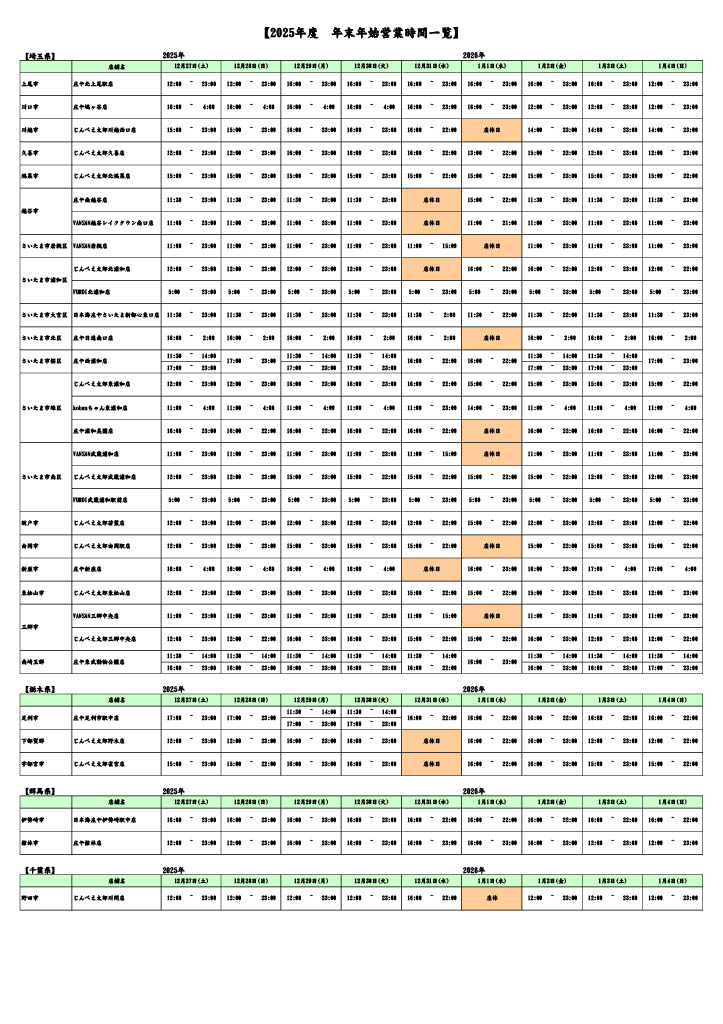 Blog店舗情報 【2025年】年末年始の営業時間のお知らせ ~2025年 年末年始の営業時間~ 2025年年末年始の各店舗の営業時間は下記となります。店舗によっては「店休日」「臨時営業時間」となっている場合がございますのでご来店の際にはお気をつけください。 2026年も株式会社かんなん丸の運営店舗を宜しくお願いいたします。 ※じんべえ太郎川間店の営業時間に一部記載間違いがありましたので12/18(木)17時30分に修正をさせていただきました。 ↓タップで拡大表示